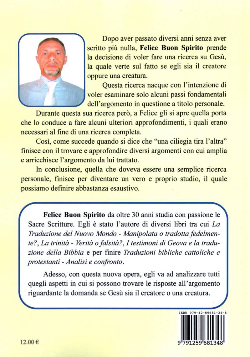 Sotto questo aspetto Felice Buon Spirito è un pragmatico e dopo aver scritto molti altri testi, condotto discussioni e innumerevoli dibattiti, focalizza ora la sua attenzione sulla figura del Cristo nell’economia della creazione. L’ambito resta sempre quello scritturale, soprattutto Neotestamentario, ma il Buon Spirito non disdegna alcuni approfondimenti su singoli versetti dell’Antico Testamento e sulle vedute di alcuni Padri della Chiesa.